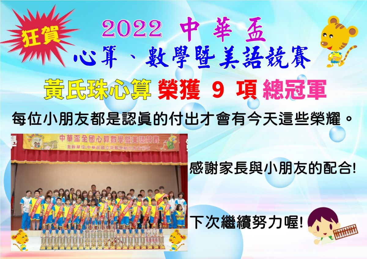 狂賀 2022 中華盃 心算數學暨美語競賽 黃氏 榮獲9項總冠軍